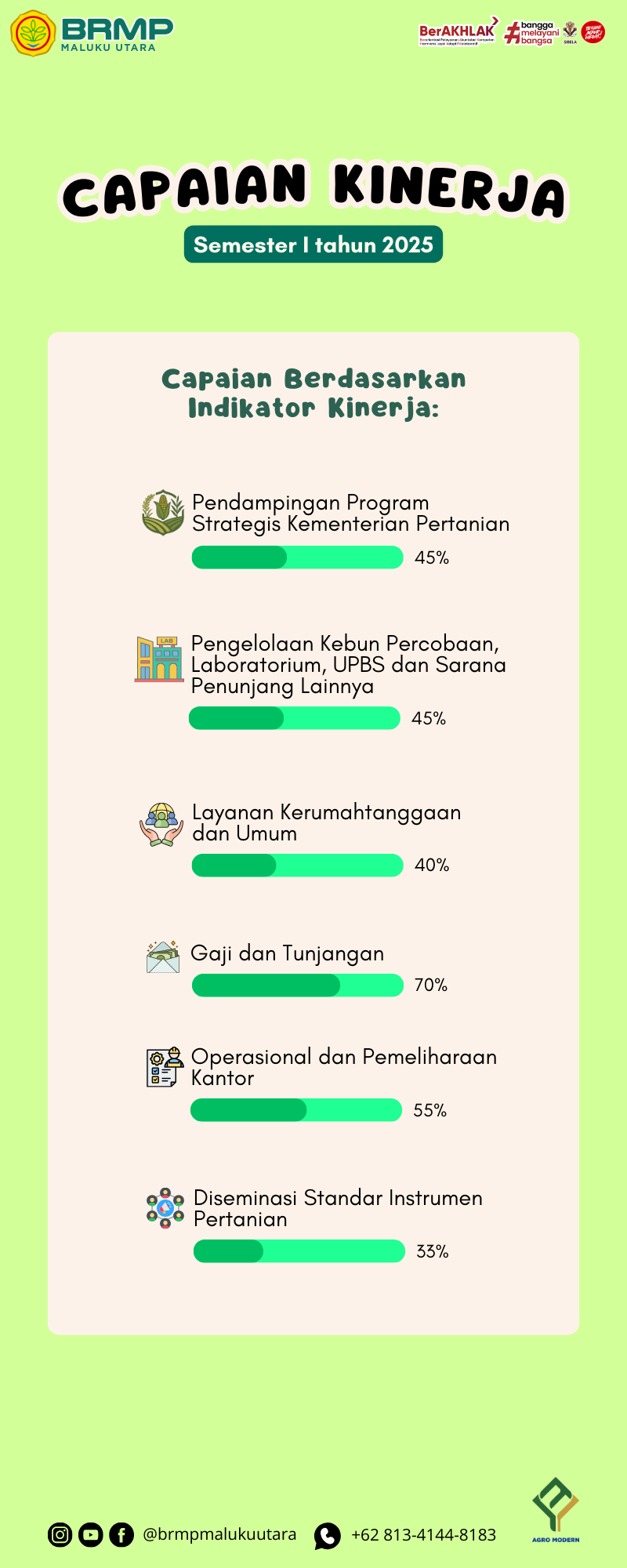Tolak ukur capaian keberhasilan program kerja Balai Penerapan Modernisasi Pertanian Maluku Utara per semester yang disampaikan dalam bentuk laporan maupun infografis.